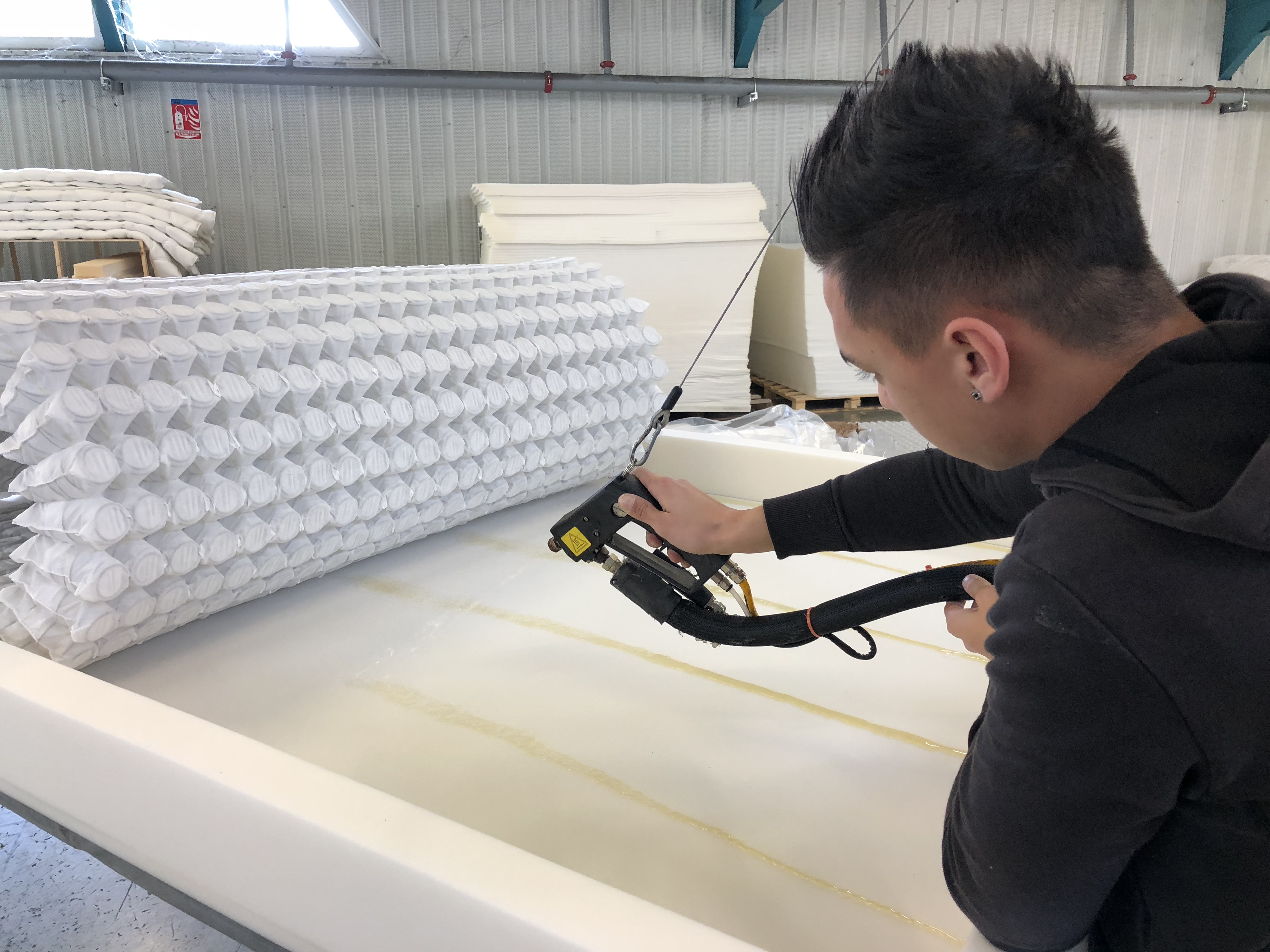 Mais la machine n’a de sens que lorsqu’elle sert la main de l’artisan : nos opérateurs, hautement qualifiés, supervisent chaque étape avec une attention humaine irremplaçable. C’est cette alliance entre innovation technologique et maîtrise manuelle qui fait la force de Mateflex Literie, et qui nous permet d’offrir des produits fiables, confortables et durables, entièrement conçus et fabriqués en France.